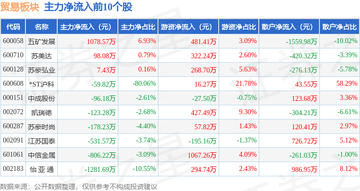 从资金流向上来看,当日贸易板块主力资金净流出1.43亿元,游资资金净流入1158.37万元,散户资金净流入1.31亿元。贸易板块个股资金流向见下表: