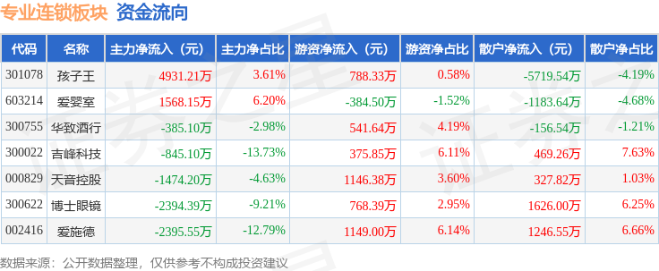 从资金流向上来看,当日专业连锁板块主力资金净流出994.99万元,游资资金净流入4385.09万元,散户资金净流出3390.1万元。专业连锁板块个股资金流向见下表: