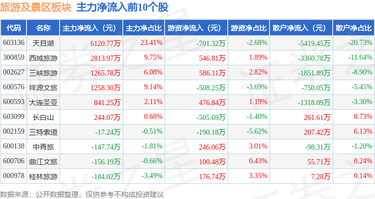 从资金流向上来看,当日旅游及景区板块主力资金净流出5230.18万元,游资资金净流出472.5万元,散户资金净流入5702.68万元。旅游及景区板块个股资金流向见下表:
