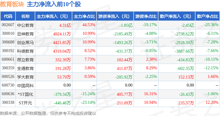 从资金流向上来看,当日教育板块主力资金净流入4.25亿元,游资资金净流出1.95亿元,散户资金净流出2.3亿元。教育板块个股资金流向见下表: