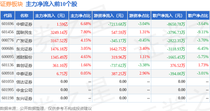从资金流向上来看,当日证券板块主力资金净流出12.63亿元,游资资金净流入4.25亿元,散户资金净流入8.38亿元。证券板块个股资金流向见下表:
