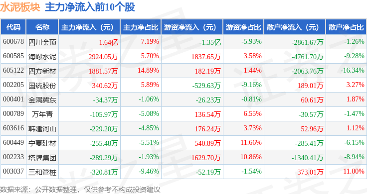 从资金流向上来看,当日水泥板块主力资金净流出7998.38万元,游资资金净流出9621.22万元,散户资金净流入1.76亿元。水泥板块个股资金流向见下表: