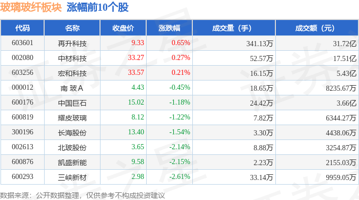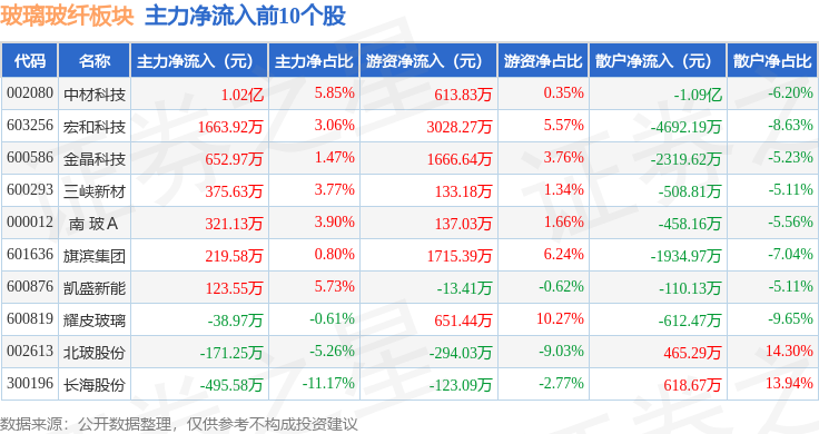 从资金流向上来看,当日玻璃玻纤板块主力资金净流出1.94亿元,游资资金净流入2.06亿元,散户资金净流出1244.88万元。玻璃玻纤板块个股资金流向见下表: