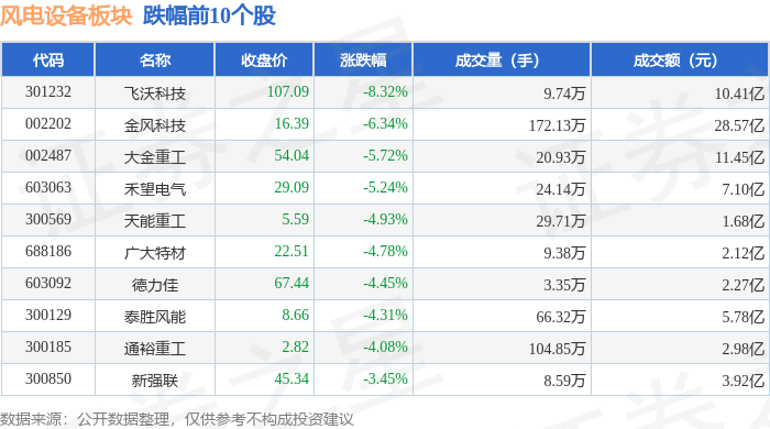 证券之星消息,12月16日风电设备板块较上一交易日下跌3.37%,飞沃科技领跌。当日上证指数报收于3824.81,下跌1.11%。深证成指报收于12914.67,下跌1.51%。风电设备板块个股涨跌见下表: