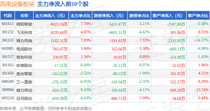 从资金流向上来看,当日风电设备板块主力资金净流出8.8亿元,游资资金净流入5883.46万元,散户资金净流入8.21亿元。风电设备板块个股资金流向见下表: