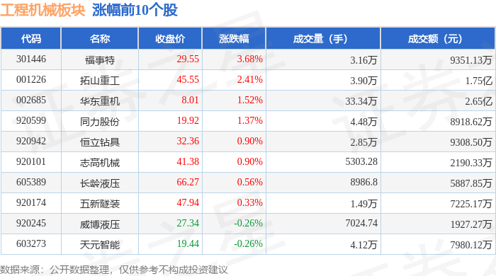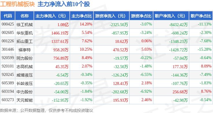从资金流向上来看,当日工程机械板块主力资金净流出4.74亿元,游资资金净流出1.38亿元,散户资金净流入6.12亿元。工程机械板块个股资金流向见下表: