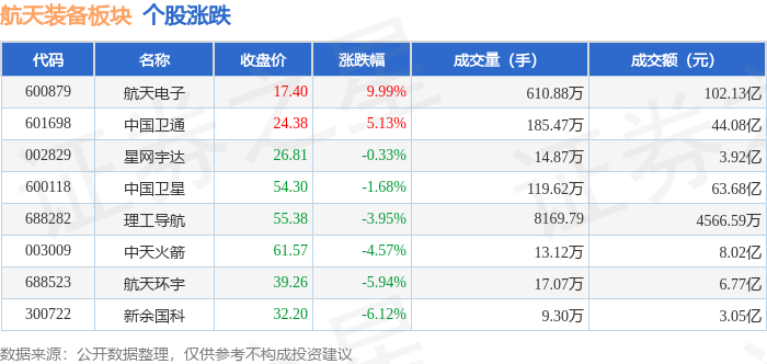 从资金流向上来看,当日航天装备板块主力资金净流入2.83亿元,游资资金净流出1.63亿元,散户资金净流出1.2亿元。航天装备板块个股资金流向见下表: