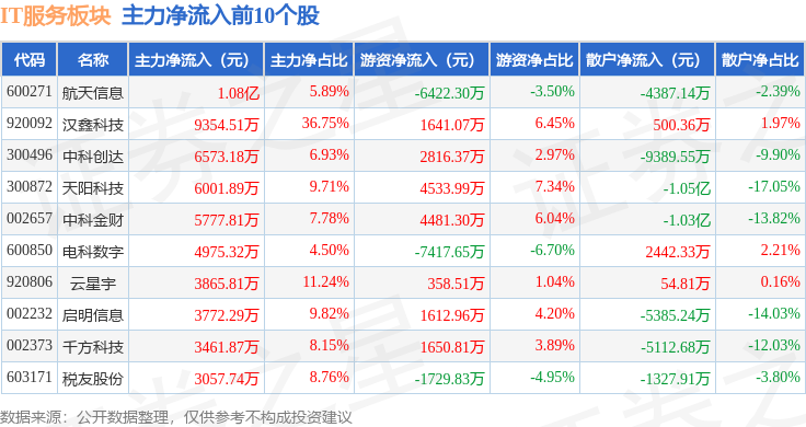 从资金流向上来看,当日IT服务板块主力资金净流出23.75亿元,游资资金净流入1.94亿元,散户资金净流入21.81亿元。IT服务板块个股资金流向见下表: