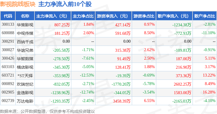 从资金流向上来看,当日影视院线板块主力资金净流出8.19亿元,游资资金净流入1.88亿元,散户资金净流入6.3亿元。影视院线板块个股资金流向见下表: