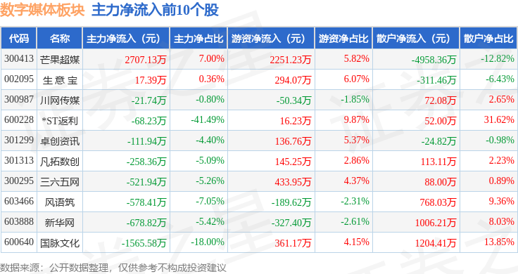从资金流向上来看,当日数字媒体板块主力资金净流出1.89亿元,游资资金净流入3489.53万元,散户资金净流入1.54亿元。数字媒体板块个股资金流向见下表: