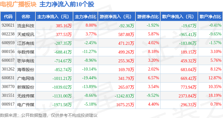 从资金流向上来看,当日电视广播板块主力资金净流出3.69亿元,游资资金净流入6529.36万元,散户资金净流入3.04亿元。电视广播板块个股资金流向见下表:
