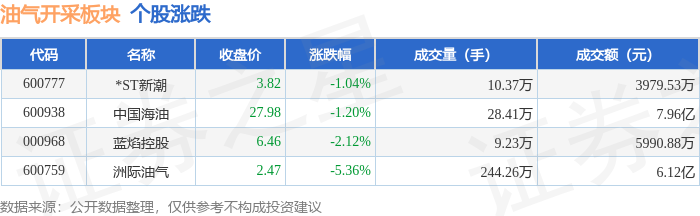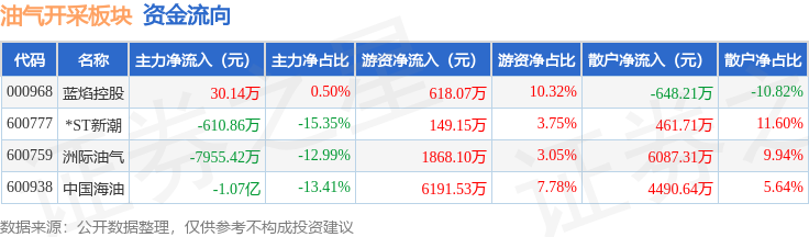 从资金流向上来看,当日油气开采板块主力资金净流出1.92亿元,游资资金净流入8826.86万元,散户资金净流入1.04亿元。油气开采板块个股资金流向见下表: