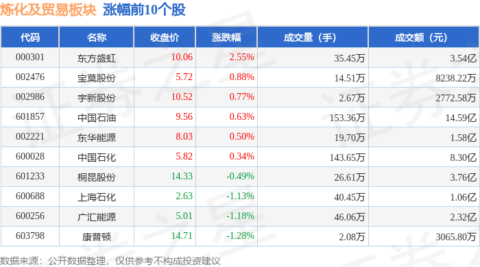 证券之星消息,12月16日炼化及贸易板块较上一交易日上涨0.12%,东方盛虹领涨。当日上证指数报收于3824.81,下跌1.11%。深证成指报收于12914.67,下跌1.51%。炼化及贸易板块个股涨跌见下表:
