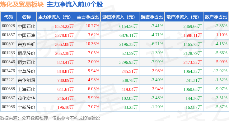 从资金流向上来看,当日炼化及贸易板块主力资金净流入207.0万元,游资资金净流出1.5亿元,散户资金净流入1.48亿元。炼化及贸易板块个股资金流向见下表: