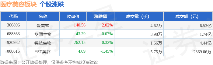 证券之星消息,12月16日医疗美容板块较上一交易日上涨0.98%,爱美客领涨。当日上证指数报收于3824.81,下跌1.11%。深证成指报收于12914.67,下跌1.51%。医疗美容板块个股涨跌见下表: