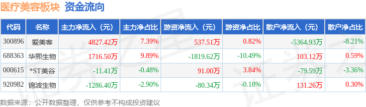 从资金流向上来看,当日医疗美容板块主力资金净流入6532.5万元,游资资金净流出1191.11万元,散户资金净流出5341.39万元。医疗美容板块个股资金流向见下表: