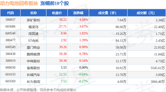 从资金流向上来看,当日动力电池回收板块主力资金净流出21.19亿元,游资资金净流出5396.42万元,散户资金净流入21.73亿元。动力电池回收板块个股资金流向见下表: