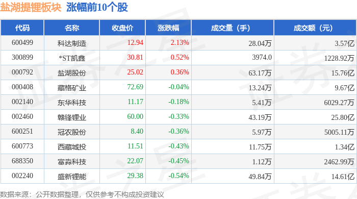 证券之星消息,12月16日盐湖提锂板块较上一交易日下跌1.97%,国机通用领跌。当日上证指数报收于3824.81,下跌1.11%。深证成指报收于12914.67,下跌1.51%。盐湖提锂板块个股涨跌见下表: