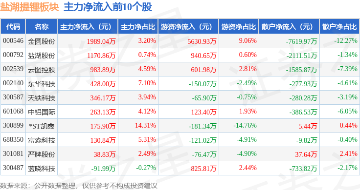 从资金流向上来看,当日盐湖提锂板块主力资金净流出24.08亿元,游资资金净流入3.97亿元,散户资金净流入20.11亿元。盐湖提锂板块个股资金流向见下表: