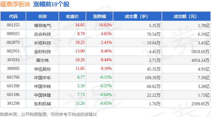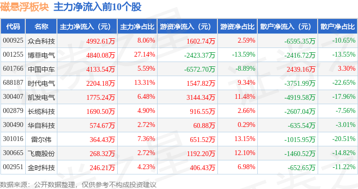 从资金流向上来看,当日磁悬浮板块主力资金净流出14.9亿元,游资资金净流入1.65亿元,散户资金净流入13.25亿元。磁悬浮板块个股资金流向见下表: