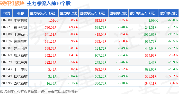 从资金流向上来看,当日碳纤维板块主力资金净流出11.09亿元,游资资金净流入1.78亿元,散户资金净流入9.31亿元。碳纤维板块个股资金流向见下表: