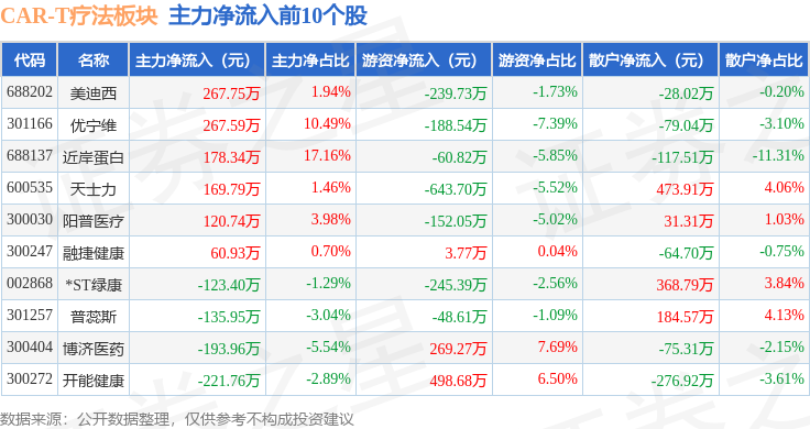 从资金流向上来看,当日CAR-T疗法板块主力资金净流出9.16亿元,游资资金净流入1.45亿元,散户资金净流入7.71亿元。CAR-T疗法板块个股资金流向见下表: