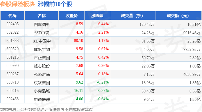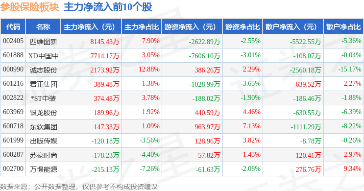 从资金流向上来看,当日参股保险板块主力资金净流出4.46亿元,游资资金净流出947.37万元,散户资金净流入4.55亿元。参股保险板块个股资金流向见下表:
