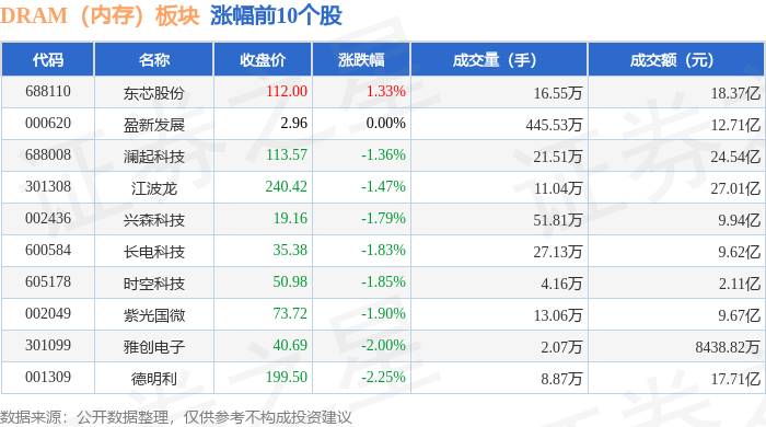 证券之星消息,12月16日DRAM(内存)板块较上一交易日下跌2.16%,大为股份领跌。当日上证指数报收于3824.81,下跌1.11%。深证成指报收于12914.67,下跌1.51%。DRAM(内存)板块个股涨跌见下表: