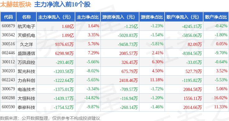 从资金流向上来看,当日太赫兹板块主力资金净流出11.69亿元,游资资金净流出1.99亿元,散户资金净流入13.68亿元。太赫兹板块个股资金流向见下表: