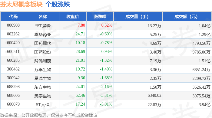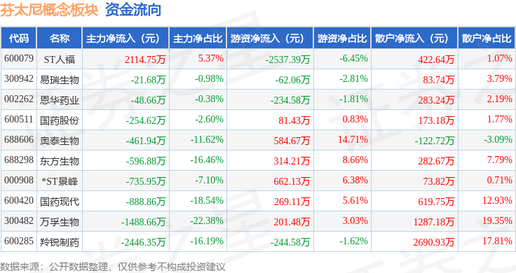 从资金流向上来看,当日芬太尼概念板块主力资金净流出4828.85万元,游资资金净流出965.6万元,散户资金净流入5794.45万元。芬太尼概念板块个股资金流向见下表: