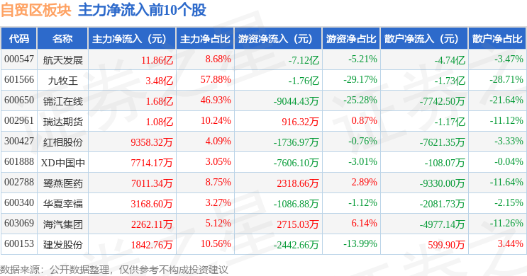 从资金流向上来看,当日自贸区板块主力资金净流出46.84亿元,游资资金净流出7.6亿元,散户资金净流入54.44亿元。自贸区板块个股资金流向见下表: