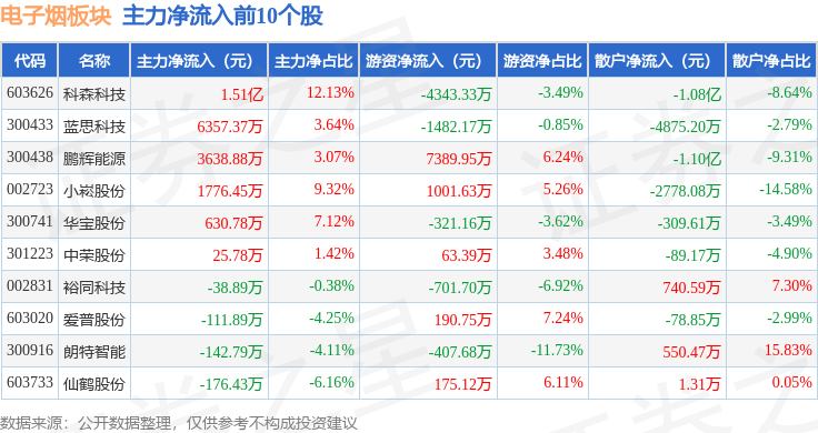 从资金流向上来看,当日电子烟板块主力资金净流出18.11亿元,游资资金净流出5564.03万元,散户资金净流入18.66亿元。电子烟板块个股资金流向见下表: