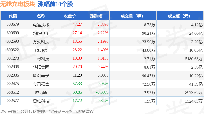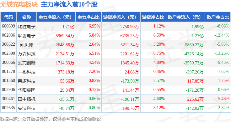 从资金流向上来看,当日无线充电板块主力资金净流出23.24亿元,游资资金净流入1.41亿元,散户资金净流入21.83亿元。无线充电板块个股资金流向见下表: