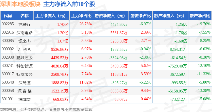 从资金流向上来看,当日深圳本地股板块主力资金净流出13.01亿元,游资资金净流入1.43亿元,散户资金净流入11.58亿元。深圳本地股板块个股资金流向见下表: