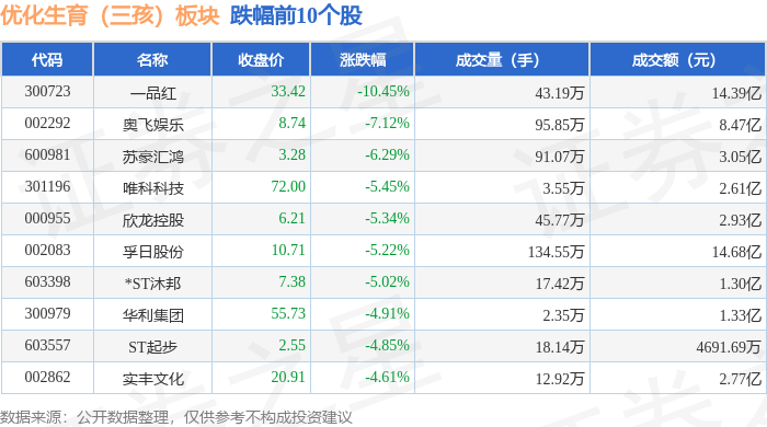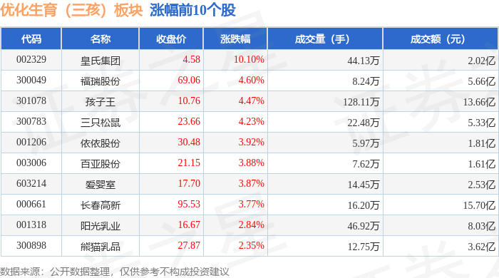 从资金流向上来看,当日优化生育(三孩)板块主力资金净流出10.79亿元,游资资金净流入3.4亿元,散户资金净流入7.39亿元。优化生育(三孩)板块个股资金流向见下表: