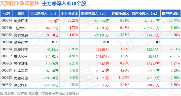 从资金流向上来看,当日天津国企改革板块主力资金净流入3497.23万元,游资资金净流出1165.69万元,散户资金净流出2331.54万元。天津国企改革板块个股资金流向见下表: