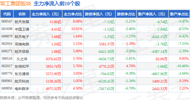 从资金流向上来看,当日军工集团板块主力资金净流出24.34亿元,游资资金净流出1.1亿元,散户资金净流入25.43亿元。军工集团板块个股资金流向见下表: