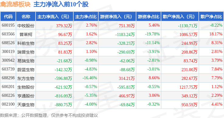 从资金流向上来看,当日禽流感板块主力资金净流出5665.13万元,游资资金净流入249.33万元,散户资金净流入5415.8万元。禽流感板块个股资金流向见下表: