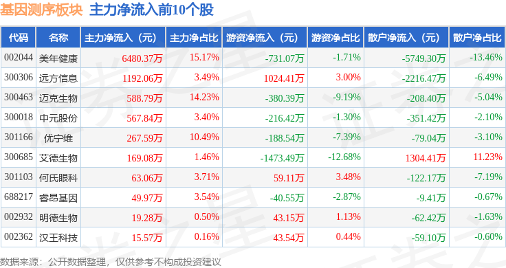 从资金流向上来看,当日基因测序板块主力资金净流出3.66亿元,游资资金净流入5595.41万元,散户资金净流入3.1亿元。基因测序板块个股资金流向见下表:
