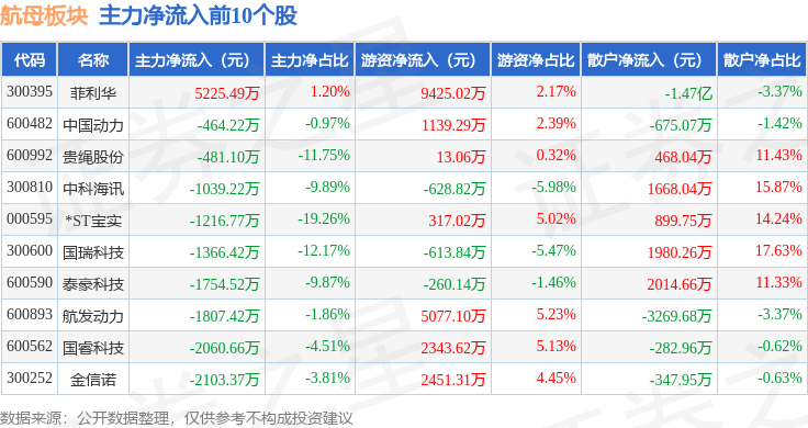 从资金流向上来看,当日航母板块主力资金净流出13.73亿元,游资资金净流入4.49亿元,散户资金净流入9.24亿元。航母板块个股资金流向见下表: