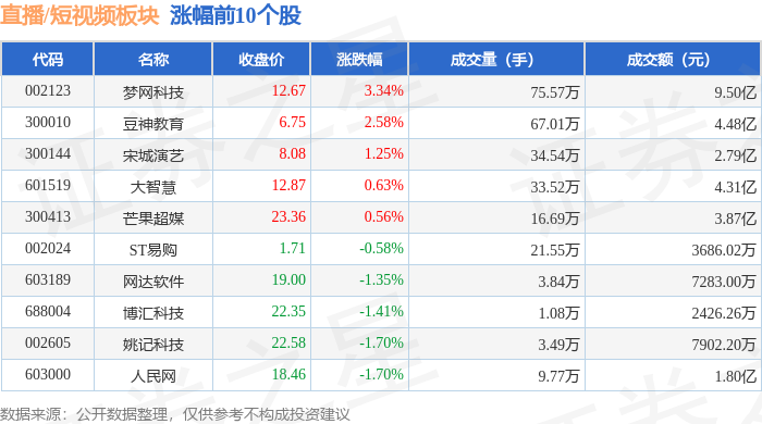 从资金流向上来看,当日直播/短视频板块主力资金净流出9.22亿元,游资资金净流入2.43亿元,散户资金净流入6.79亿元。直播/短视频板块个股资金流向见下表: