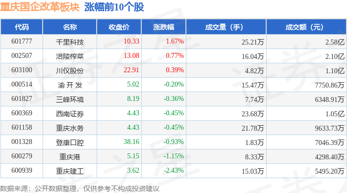 从资金流向上来看,当日重庆国企改革板块主力资金净流出1.63亿元,游资资金净流入5277.81万元,散户资金净流入1.11亿元。重庆国企改革板块个股资金流向见下表: