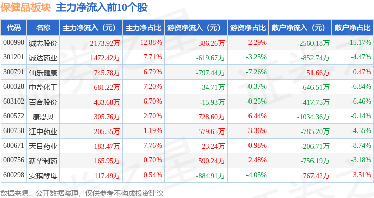 从资金流向上来看,当日保健品板块主力资金净流出11.5亿元,游资资金净流入2.7亿元,散户资金净流入8.79亿元。保健品板块个股资金流向见下表: