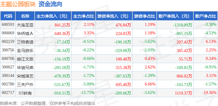 从资金流向上来看,当日主题公园板块主力资金净流出854.1万元,游资资金净流入696.99万元,散户资金净流入157.11万元。主题公园板块个股资金流向见下表: