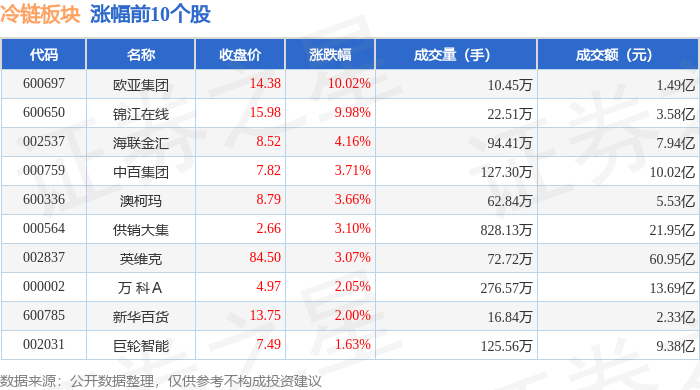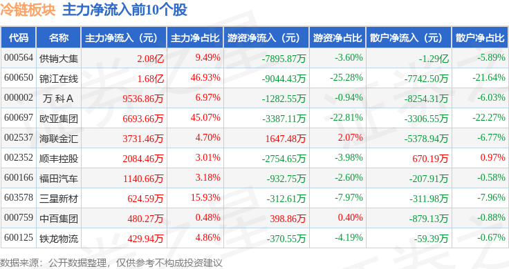 从资金流向上来看,当日冷链板块主力资金净流出19.59亿元,游资资金净流出1.99亿元,散户资金净流入21.58亿元。冷链板块个股资金流向见下表: