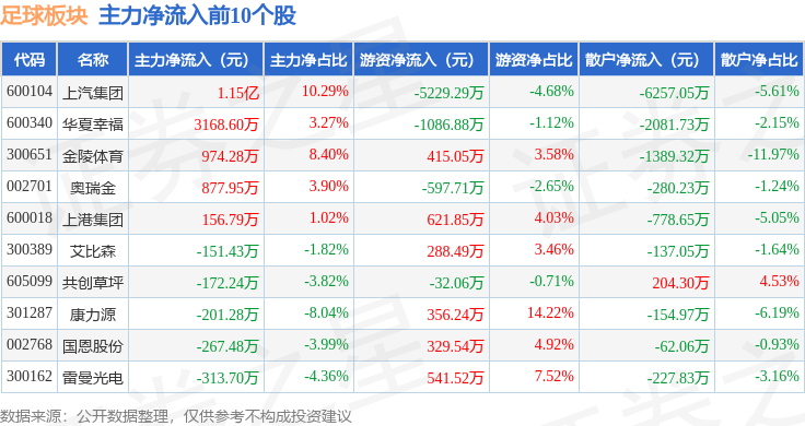 从资金流向上来看,当日足球板块主力资金净流出6952.12万元,游资资金净流出458.88万元,散户资金净流入7411.0万元。足球板块个股资金流向见下表:
