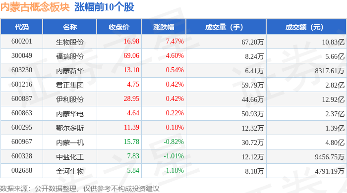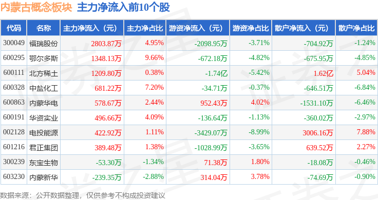 从资金流向上来看,当日内蒙古概念板块主力资金净流出6.27亿元,游资资金净流入243.09万元,散户资金净流入6.25亿元。内蒙古概念板块个股资金流向见下表: