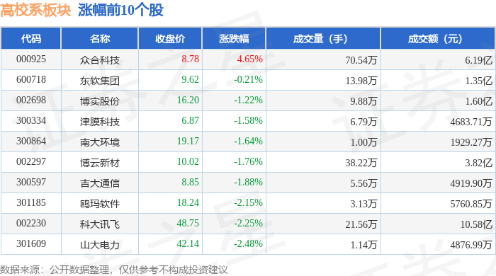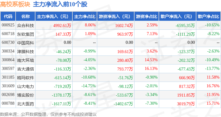 从资金流向上来看,当日高校系板块主力资金净流出7.28亿元,游资资金净流入1.96亿元,散户资金净流入5.33亿元。高校系板块个股资金流向见下表: