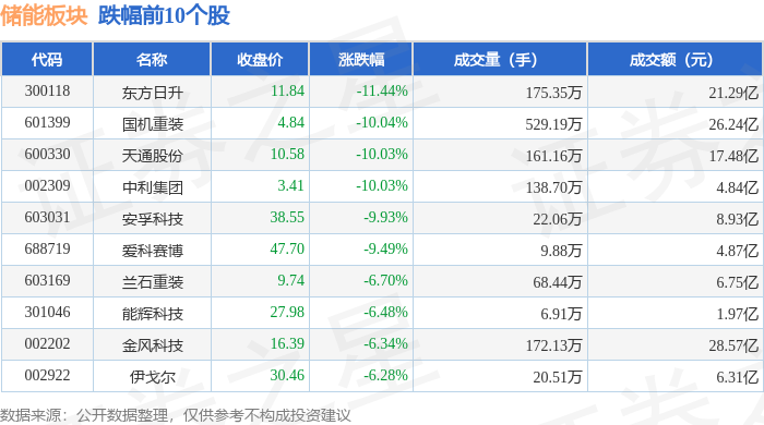 从资金流向上来看,当日储能板块主力资金净流出144.38亿元,游资资金净流入18.95亿元,散户资金净流入125.43亿元。储能板块个股资金流向见下表: