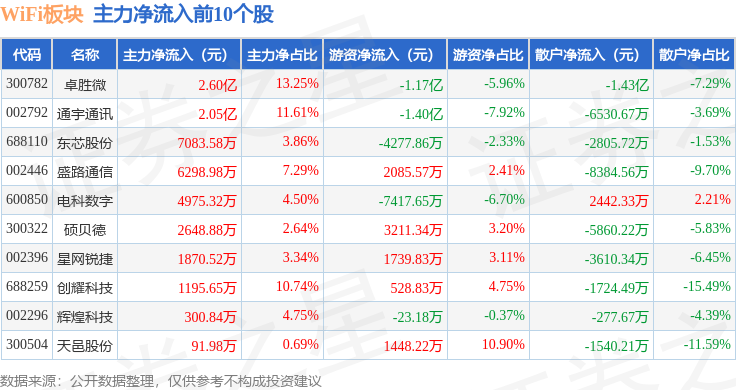 从资金流向上来看,当日WiFi板块主力资金净流出10.98亿元,游资资金净流入5943.36万元,散户资金净流入10.39亿元。WiFi板块个股资金流向见下表:
